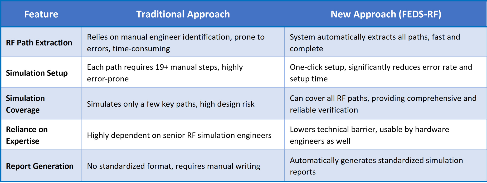 As can be seen from the above practical applications, the RF automation development function has demonstrated impressive efficiency. Industry field tests show that RF path checking time can be drastically reduced from a traditional 100 hours to approximately 12 hours. Previously, simulation engineers could manually create simulation environments for a maximum of 80 paths. Now, the automation development function can automatically process over 130 paths, significantly enhancing coverage and accuracy. The development team is already moving towards the next milestone, starting from a human mindset and finding the best solution for the project requirements through this automated development tool. Compared to traditional approaches, automated development tools bring significant benefits at different levels of the overall project.