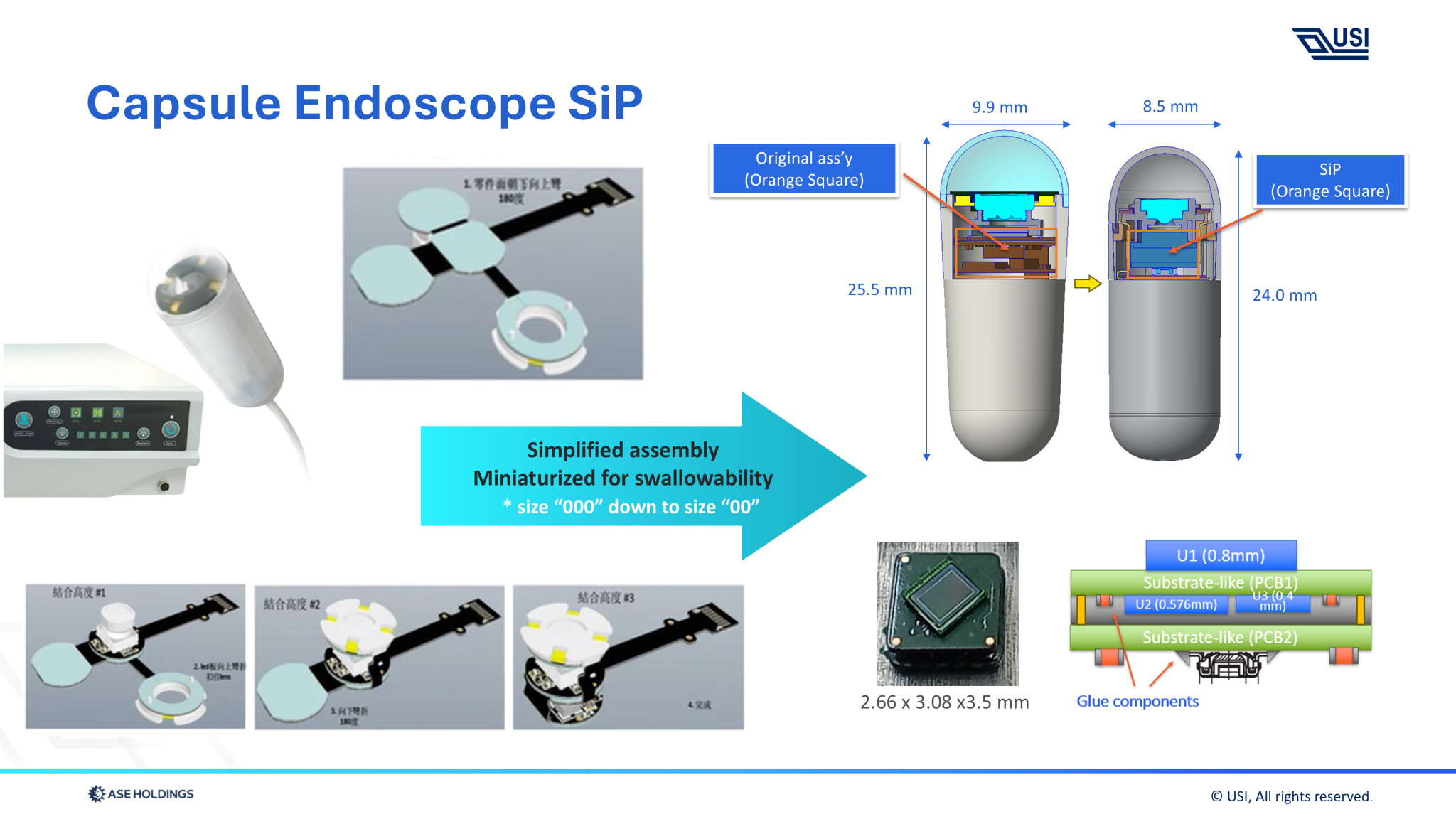 One of SiP's core benefits is miniaturization. Dr. Fang cited a smartwatch project where USI integrated an MCU, LPDDR2 memory, and 76 passive components, reducing the functional circuit area from 221mm² to just 81mm²—a 63.4% reduction. Another extreme example is the capsule endoscope, where SiP technology enabled ultra-compact circuitry, significantly improving patient comfort.