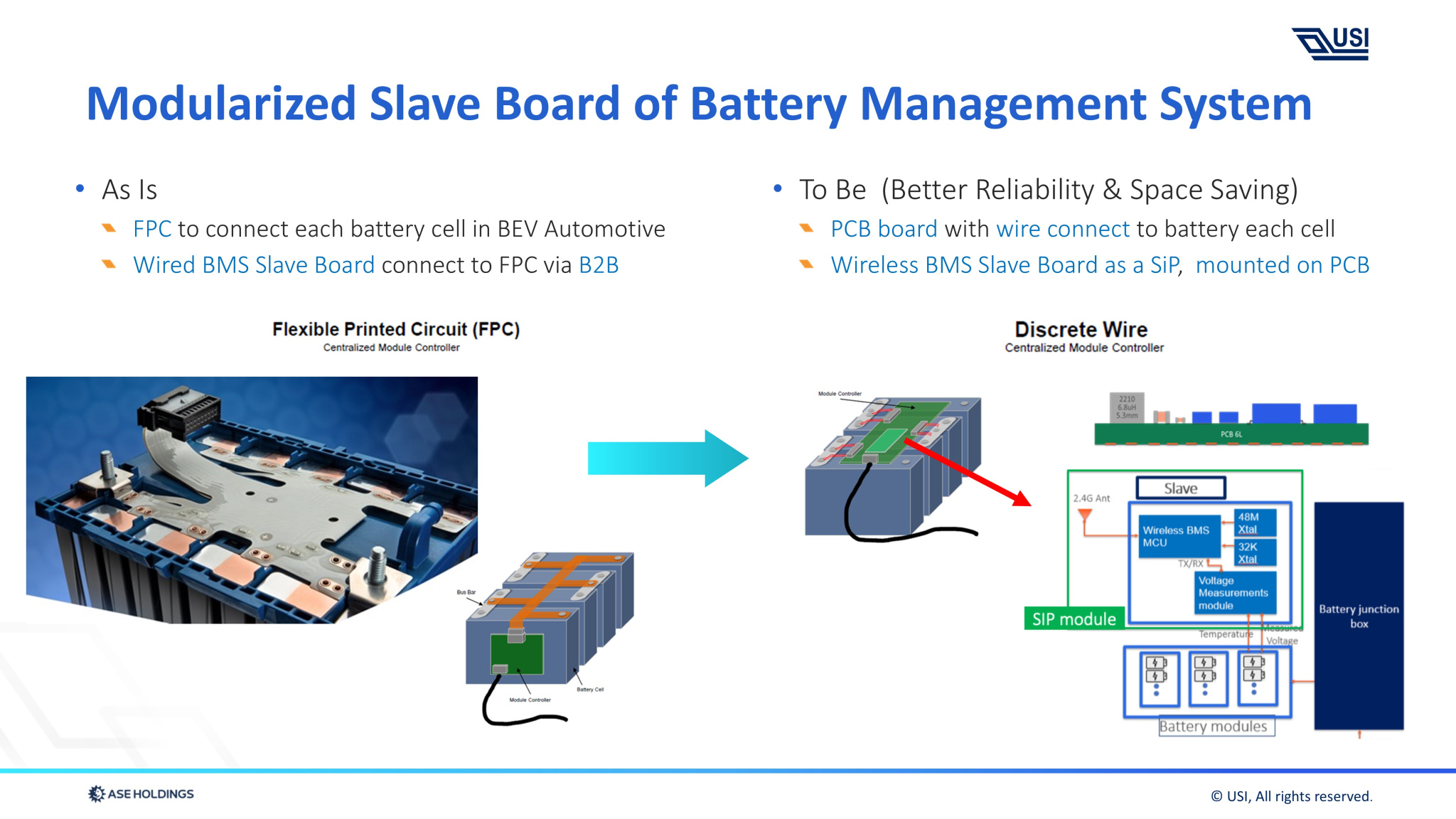 • EV Battery Management System (BMS): Transitioned from traditional FPC-based architecture to wireless SiP modules, improving reliability and saving space.