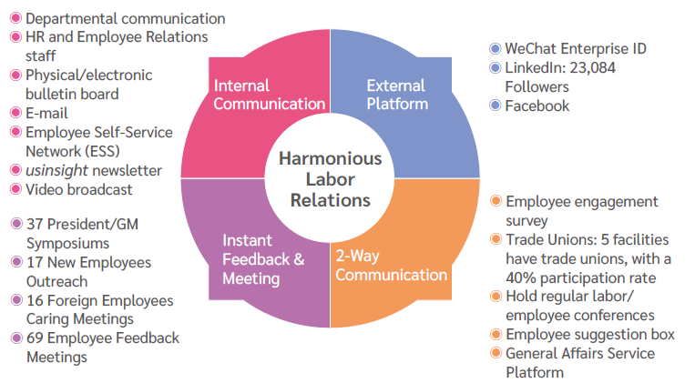 - Now, in addition to the Nantou Facility and the new setting Vietnam Facility, which have not established trade unions, the Zhangjiang Facility, Jinqiao Facility, Huizhou Facility, Kunshan Facility, and Mexico Facility have established their trade unions, and group agreements are signed with the trade unions. Employees participating in the trade union enjoy the protection of group agreements. The group agreement coverage rate is around 58% (Group agreement coverage rate = Number of employees covered by the group agreement in the facility area ÷ the number of total employees at the end of the year × 100%).