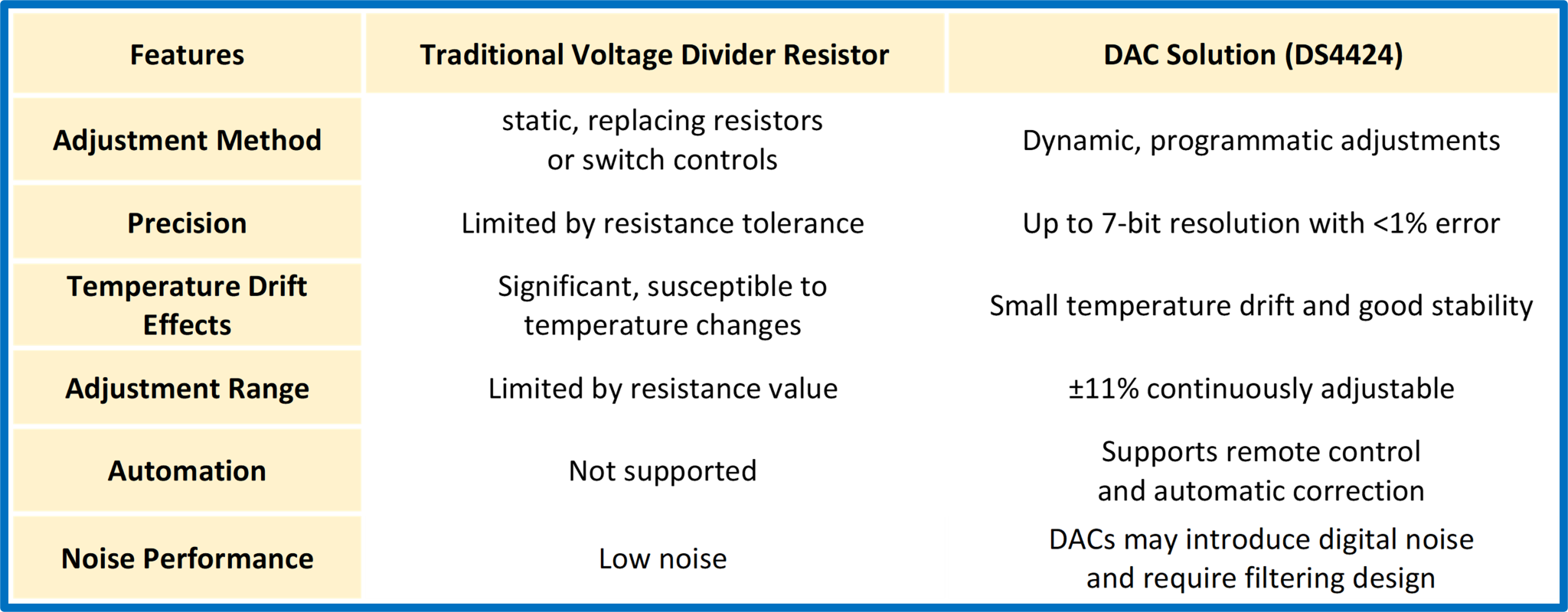 Compared with the traditional method of adjusting the output voltage by changing the voltage divider, the DAC solution has obvious advantages in terms of adjustment accuracy, adjustment range, adjustment method, automation support, and temperature drift influence: